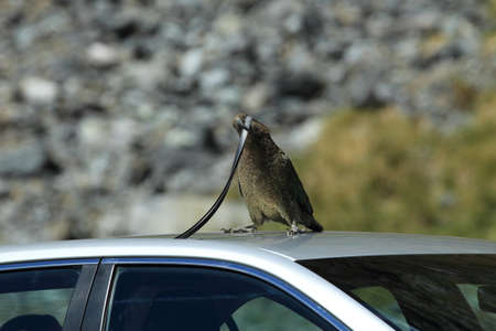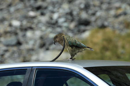 Endemic New Zealand alpine parrot Kea, Nestor notabilis, tries to steal rubber part from car with its strong curved beak