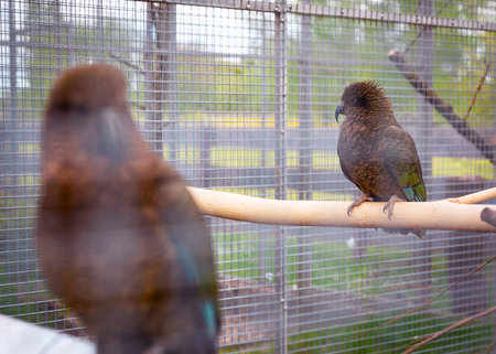 Friendly Kea Parrots on Wooden Branch Inside Bird Sanctuary