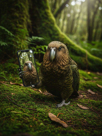 A curious kakapo parrot takes a selfie in a lush forest environment