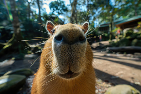 Capybara Close up Portrait, Fun Animal Looking into Camera, Capybara Nose, Wide Angle Lens, Funny and Adorable Animal, Oversized Cute Nose, Generative AI Illustration