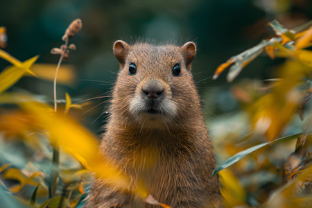 This captivating close-up image features a capybara gazing thoughtfully amid a lush green backdrop, enhanced by beautiful bokeh effects.