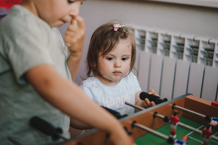 Cute girl and a boy learning playing the table football by touching the part of table football. Toddler development concept. Children play table games. Happy family. Fun family.