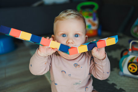 Baby plays at home with educational toys close-up and copy space. Child facial expressions at 7 months