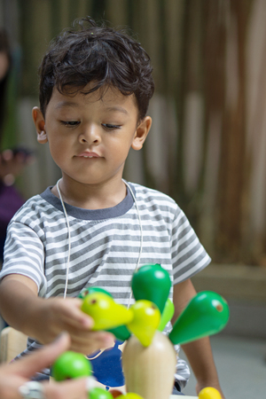 Portrait of curly-haired cute boy playing educational game in kindergarten