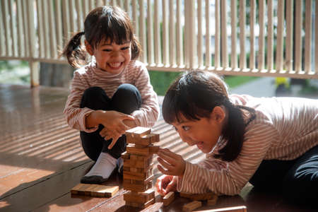 Happy Asian woman enjoy playing a wood block game in the living room during the free time.