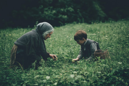 Grandmother and grandson are crouching in a meadow, carefully searching for four leaf clovers