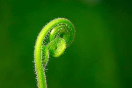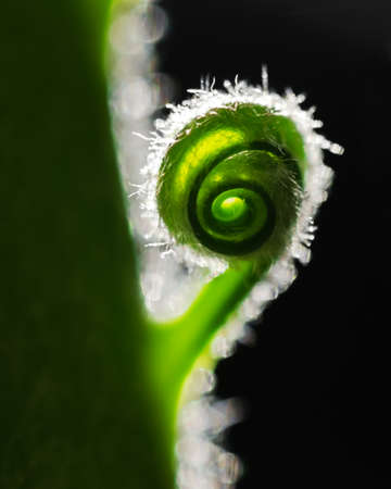 A close-up of the spiraled tip of an unfurling fern frond, symbolizing growth and the beauty of nature's intricate design.