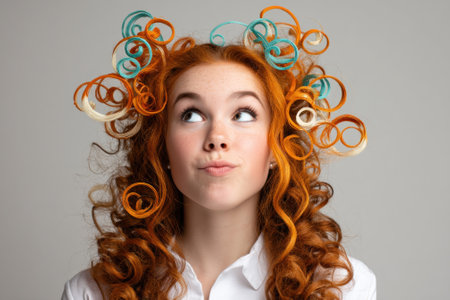 Young woman with curly red hair and colorful plastic spirals in hair, wearing white shirt. Her expression is playful and thoughtful, looking upwards. Light gray backdrop