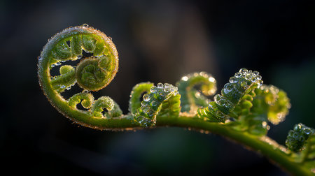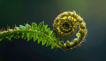 A macro photograph captures a vibrant green fern frond with a tightly coiled spiral unfurling, illuminated by soft light against a dark, blurred...