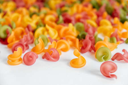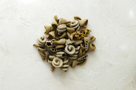 Multicolored pasta scattered on a white background. Top view. Copy, empty space for text.