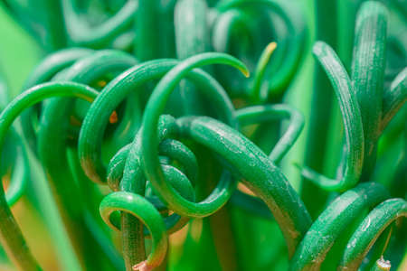 Natural background of green cucumber bush with spiral mustache, extreme close-up with dew