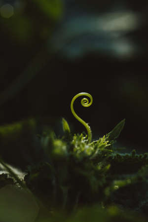 Fern unravelling close-up on dim background