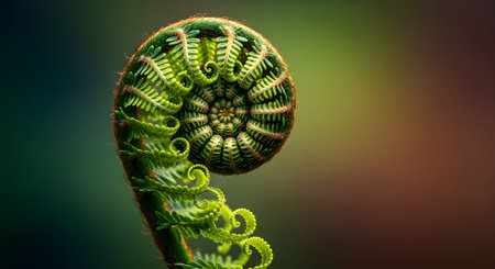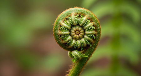 The intricate spiral pattern of an unfurling fern illustrating the natural beauty and perfection of nature's design.