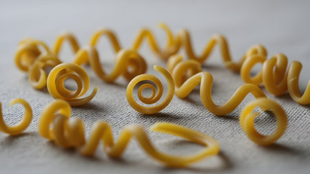 Close-up of raw, spiral-shaped pasta scattered across a textured grey fabric background. The golden-yellow uncooked noodles feature intricate curls, highlighting the detail of the pasta design and texture.