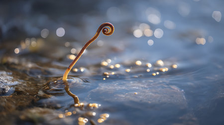 Macro shot of a small fern in the water at sunrise