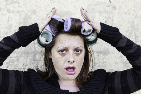 Vibrant Young Woman with Hair Rollers Smiling and Posing for a Fun Portrait