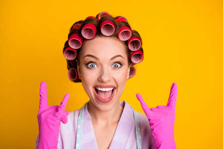 Close-up portrait of glamorous crazy funky cheerful maid wearing rubber gloves showing horn sign isolated bright yellow color background