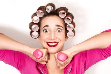 Beauty, happy girl smiling. Makeup and hairstyle. Using curlers. Looking at camera. Retro, pin up. White background