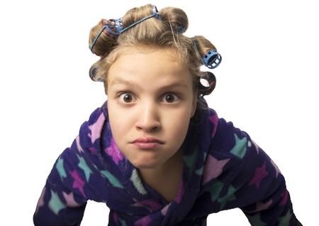 Displeased red-haired girl holds her arms crossed near the face. She looks with a sullen expression, being unhappy as she was curled on hair curlers. Does not want to have a curly hairstyle, posing