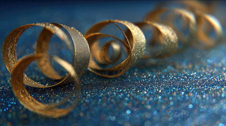 A stunning close-up of glittering gold streamers set against a sparkling blue background, perfect for enhancing the festive atmosphere of celebrations and events.