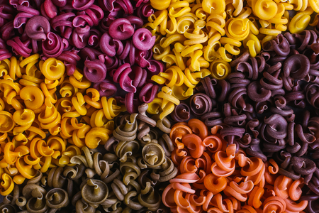 Multicolored macaroni of unusual shape with natural vegetable dyes, lined in circle. Background closeup.