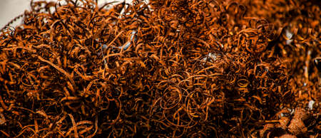 Close-up view of rusty metal shavings with selective focus. Metal shaving - industrial garbage. Abstract orange background