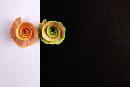 Top shot of two pencil shavings on white and black background with copy space in education concept