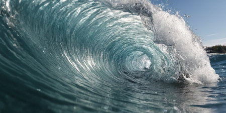 Dynamic Ocean Wave A powerful ocean wave curls perfectly, creating a crystal-clear aqua tunnel with white foam cresting at