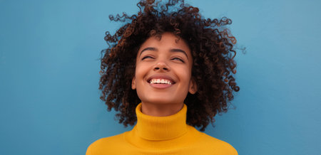 A woman with dark, curly hair laughs with her head tilted back and eyes closed. The image features warm tones of yellow and brown, creating a radiant and cheerful ambiance. The composition is close-up, highlighting the woman's expression. It could be suitable for various commercial or editorial uses.