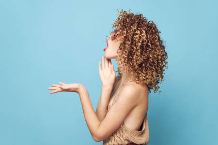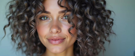 Womens natural beauty, the concept of happiness. A beautiful portrait of a Caucasian woman with clean healthy skin and afro curls. Curly locks on the face. High quality photo