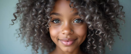 Smiling portrait of Latina teenager on gray background. Close-up of young girl with happy curly hair.
