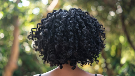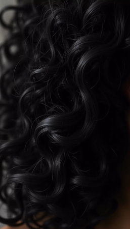The beautiful curls of shiny black hair are displayed in a close-up, emphasizing their vibrant texture and healthy sheen under soft afternoon light. Care cosmetics. Generative AI.