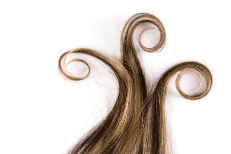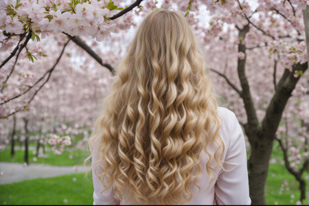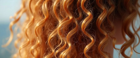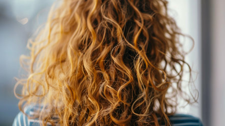 A woman's hair is curled and has a golden hue. The hair is long and flowing, and it is styled in a way that accentuates its natural texture. Scene is one of elegance and sophistication
