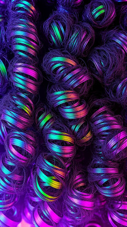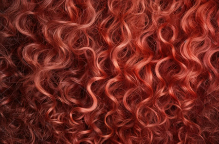 Close-up showcases radiant bright red hair with defined curls, capturing glossy texture and natural shine under soft lighting. Intricate details of each curl enhance the overall beauty. Generative AI.