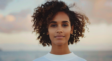A woman with curly hair is enjoying the sunset on a beach, with her eyes closed and face tilted towards the sky.