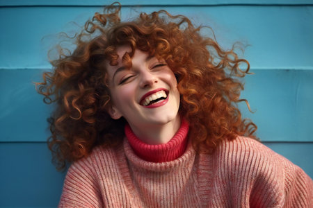 A radiant young woman with lively, curly crimson hair beams with genuine happiness, her confident presence shining through in a softly blurred backdrop.