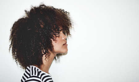 Close up side portrait of beautiful young african american woman smiling and looking up