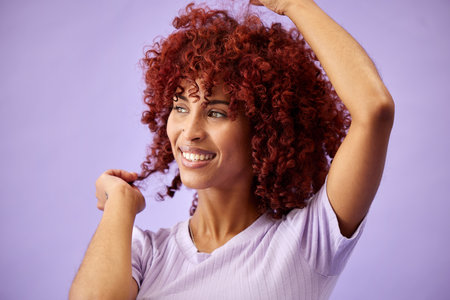 Black woman, hair care and face with smile, natural afro and growth for glow and shine in studio on purple background. Wellness, person and healthy texture of cream and argon oil cosmetics indoor