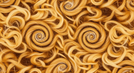 Golden spiral curls in a dense pattern forming abstract swirls with rich texture and intricate, vibrant looping hair strands.
