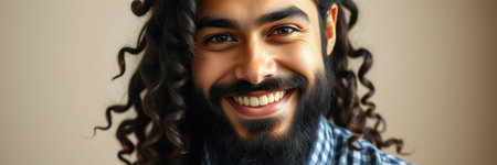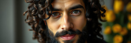 Portrait of handsome young man with long black curly hair and beard