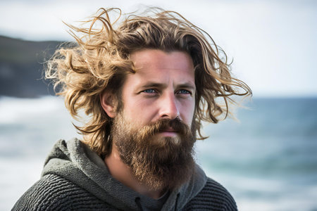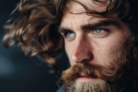 Detailed view of a man with rugged beard and tousled long hair, A man with a rugged beard and tousled hair