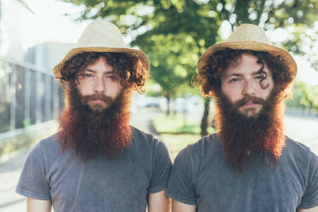 Portrait of identical male hipster twins wearing straw hats on sidewalk