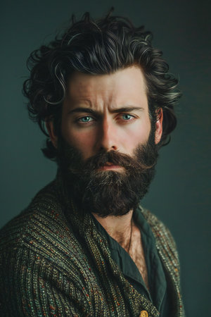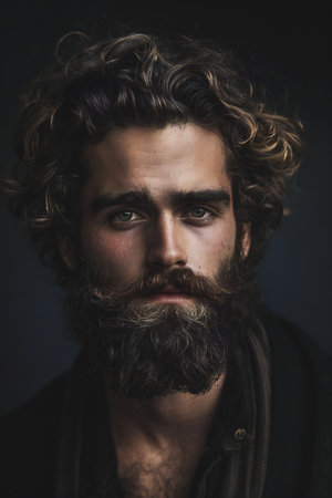Expressionless young man with wild facial hair growth and textured beard, styled in a moody low-light portrait
