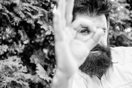 Excellent concept. brutal bearded hipster with ok gesture. successful businessman. business success. Spying watching and observing. I am watching you. Perfect gesture. Be sure. Satisfied with result