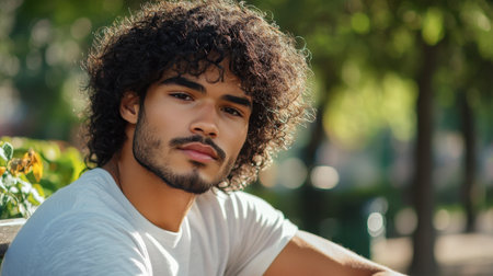 A man with thick, curly hair sitting on a park bench, his hair adding texture and volume to his overall look.