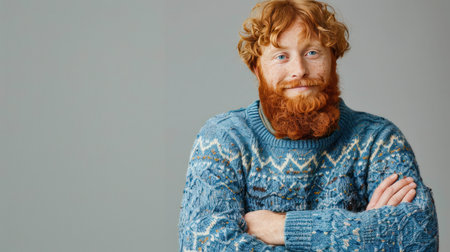 Young adult handsome red haired man portrait, nordic type male model with red hair and beard, studio shot, background with copy space, diversity and different beauty concept, AI generated