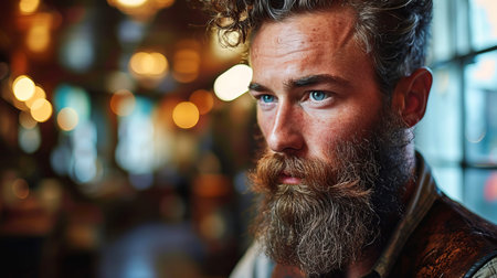 Close up portrait of gazing, bearded young male hipster