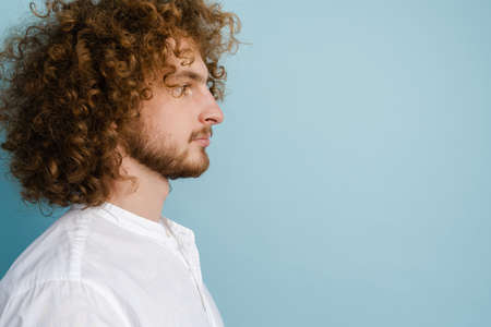 Young curly man with ginger hair posing and looking aside isolated over blue background