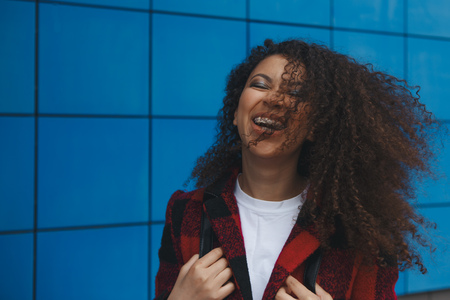 Portrait of cheerful woman with big afro and beautiful smile standing outside against a brick wall. Carefree woman posing outside during the day