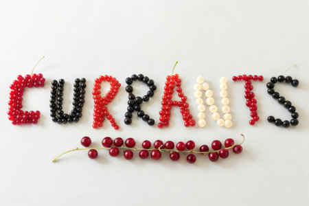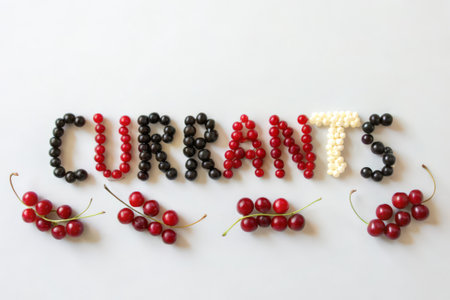 Red and black currant on a white background with the word carrots
